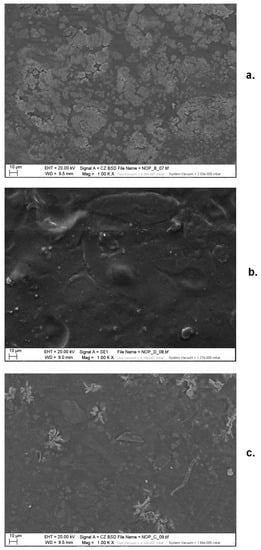 SEM images of blended films TPS–nopal mucilage (type MA (a.), ME (b.). and MPM (c.)). Magnification 1000×.