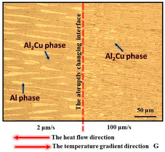 - After the abruptly changing interface, Al-Al2Cu eutectic lamellar spacing decreased. Al2Cu phase was bifurcated to form the new lamellar to refine in the three-dimensional microstructures.