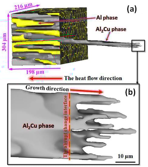 In order to further investigate the eutectic spacing adjustment process, the three-dimensional (3D) microstructure of eutectic phase on the abruptly changing interface were reconstructed by the serial sectioning technique [23,24], as shown in Figure 2. The yellow part was Al phase lamellar and the dark gray part was Al2Cu phase lamellar in Figure 2a, which growth coupling together. The growth direction of eutectic was not completely parallel to the heat flow direction. After the pulling rate suddenly increased to 100 μm/s, there might be interface instability. Then eutectic Al2Cu phase branch began to fork repeatedly in Figure 2b. While, the continuous forking process was not completed at the same place and the abrupt changing interface in Figure 2b. The phase splitting, the inner concave and the branching process of the eutectic phase were observed at a different place. It could be continuously carried out in a completely three-dimensional behavior. The same forking process was true for the eutectic Al phase. Therefore, the Al/Al2Cu eutectic spacing adjustment was ongoing in three-dimensional space, which was different from the simple two-dimensional eutectic spacing adjustment. The above results indicated that the three-dimensional (3D) microstructure of eutectic phase in this work could be more clearly shown the eutectic lamellar growth process [20,22]. Through Al and Al2Cu phase continuous forking, the size of eutectic lamellar was obviously decreased and Al/Al2Cu eutectic spacing was also reduced rapidly. In addition, after the pulling rate abruptly changed, the growth direction of eutectic was also not completely parallel to the heat flow direction. On the basis of the above results, we know that the instability of the eutectic interface caused the two phases to adjust the lamellae bifurcation in three-dimensional space. Its size and spacing were reduced, and then the regular lamellar microstructure was refined quickly. While, the growth behavior may be also responsible for those regular lamellar microstructures.