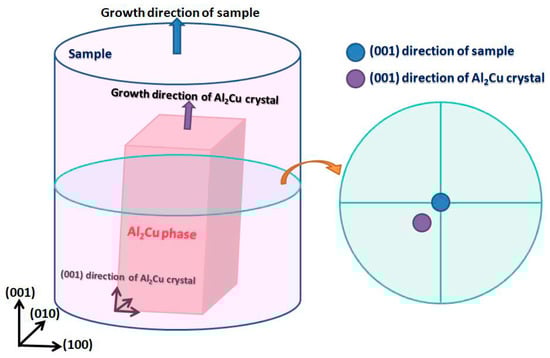 In order to further study the growth process of eutectic lamellae, the growth orientations of Al2Cu phase in eutectic in an abruptly changing under directional solidification were investigated and characterized by the EBSD analysis [25]. First, the schematic diagram of (100)-pole figure analysis of sample orientation by EBSD test was shown in Figure 3. When the crystal was grown inside the sample, its growth direction was different from that of the sample. That is to say, there were two coordinate systems in space for crystal and sample. The (100)-pole figure was taken the sample coordinate system (100) as the polar axis, and then investigated the orientation relationship of the crystal coordinate system in the sample coordinate system. Therefore, the growth direction of Al2Cu phase was its (001) direction [22], and the growth direction of the sample was (001) axial direction also the heat flow direction. It can be simply considered that when the cross-section of the left figure was the (100)-pole figure in Figure 3. The central position of the pole figure was the (001) axial direction of the sample, and the purple position in the figure was the (001) growth direction of Al2Cu phase. The deviation angle between the (001) growth direction of Al2Cu phase and (001) axial direction of the sample could be reflected by their distance.