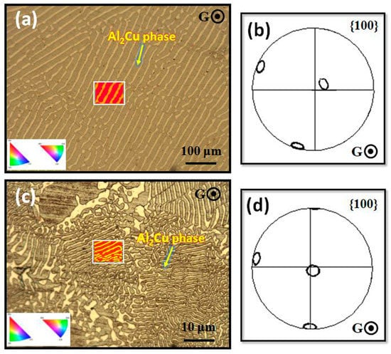 On that basis, Figure 4 shows the EBSD maps in the transverse section, the corresponding (100)-pole figures of Al2Cu phase at the abrupt change in pulling rate from 2 μm/s to 100 μm/s, respectively. The regular eutectic lamellar microstructure could be observed at solidification rate of 2 μm/s in Figure 4a. From the pole figure, it was easily deduced that Al2Cu phase in eutectic had oriented with its (001) crystal direction. The (001) direction was almost near the heat flow direction in Figure 4b. Then, the deviation angle between (001) direction of Al2Cu phase and the heat flow direction were about 10.57°. After the abrupt velocity, the microstructure was also the regular eutectic lamellar. The main growth orientation of eutectic Al2Cu phase was also its (001) direction at 100 μm/s in Figure 4c; as observed in Figure 4d, which has been historically relevant. The deviation angle between its (001) direction and heat flow direction were about 8.02°, and the growth orientation of Al2Cu phase was further closed in the heat flow direction after the abruptly changing. That agreed well with the 2D and 3D microstructure results in Figure 1 and Figure 2. The above results were indicated that the growth orientation of eutectic was not changed whether or not it bifurcated directly or re-nucleated near the abruptly changing interface instability. There was no other lateral growth direction existing. The growth direction may promote the lamellar spacing adjustment after the interface instability at the abrupt change velocity.