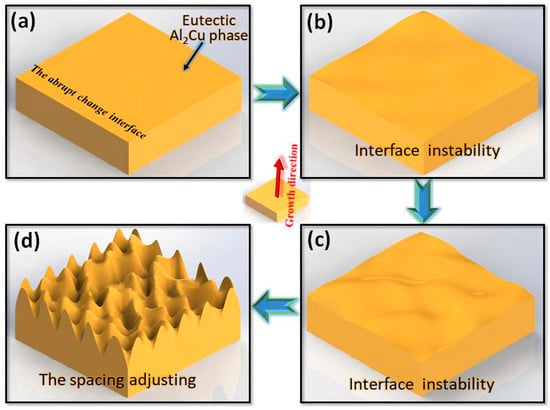 In this work, we gave a brief illustration on Al-Al2Cu regular eutectic lamellar bifurcating when the velocity was changed abruptly under directional solidification. First, before abruptly changing, the solid-liquid interface was stable, as shown in Figure 5a. At this stage, the size of eutectic Al2Cu phase was larger, resulting in larger spacing between eutectic lamellar. The eutectic Al2Cu phase grew along its (001) direction neat the heat flow direction. With the velocity changing, eutectic interface was easily affected by kinetics and began to be more unstable, as in Figure 5b [26,27]. Then, the solid-liquid interface instability became increasingly obvious (Figure 5c), and fluctuate and bifurcate to form a new interface, leading to solute enrichment and the interfacial surface energy difference. Finally, at the position far from the abruptly changing interface, the new interface would be moved forward and formed the new lamellar in Figure 5d. While, the rate of atoms deposition on different crystal planes changed based on the results on solute enrichment, When the Al2Cu phase was grown, solute atoms were aggregated easily on the crystal plane with higher interfacial surface energy, which resulted in the anisotropy of the interfacial surface energy. The anisotropy of interfacial surface energy gradually determined the Al2Cu phase growth. However, the transverse interface energy of the Al2Cu phase was smaller, which resulted in the hindrance of the lateral solute diffusion. Then, that was not conducive to atom deposition and the new lateral interface growth. While, the (001) growth orientation of the Al2Cu phase began to deflect to the preferred orientation. Therefore, the new lamellar continued to grow along its (001) direction, and was closer to the heat flow direction, resulting in smaller lamellar spacing. During the whole process, no other lateral growth direction of eutectic lamellar appeared. This work indicated that when the eutectic lamellar was refined because of the hindrance of the lateral solute diffusion after the interface instability, and then the solid-liquid interface of eutectic mainly moved along the heat flow direction [28].