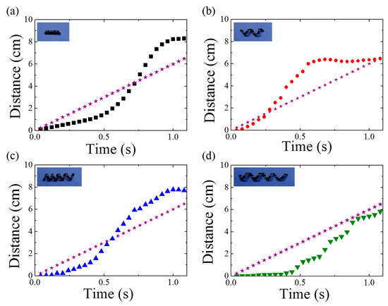 By comparing D5-L20 and D5-L25, the effects of weight and helical pitch on the magnetomotility can be investigated. An increase in weight caused an increase in the effect of inertia at the initial stage, resulting in a delay to reach the critical rapid rolling. However, D5-L25 completed a longer distance after rolling because of the smaller helical pitch. From Figure 2d, a significantly different magnetomotility value was observed. The distinctly different intermittent movement of D5-L35 has been attributed to the local deformation [27] originating from the large length and helical pitch.