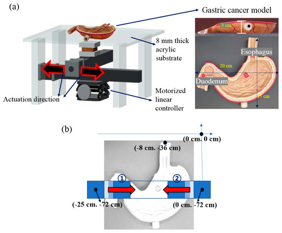 (a) Schematic of the experimental setting of the gastric cancer model; (b) Structural information of the stomach using the cancer model. Coordinate information for the experiment starts from the esophagus (①) and duodenum (②).