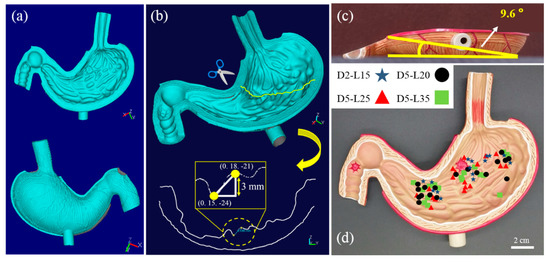 (a) Three-dimensional (3D) scanned images from the top and bottom of the gastric cancer model; (b) Sectioning and measurement of 3D location information for calculating wrinkle height in the gastric cancer model; (c) Angle of the slope of overall gastric cancer model obtained using the coordinate information; (d) Cessation location of magnetic actuation indicated for helical soft robots.