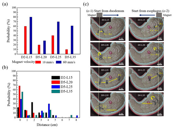 (a) Probability of successful magnetic actuation of helical soft robots by exceeding static friction at magnetic velocities of 10 mm/s and 60 mm/s; (b) Histogram of traveled distance using magnetic actuation for the four samples; (c) Representative images of magnetomotility for the four different samples for esophagus departure (1) and for duodenum departure (2) cases.