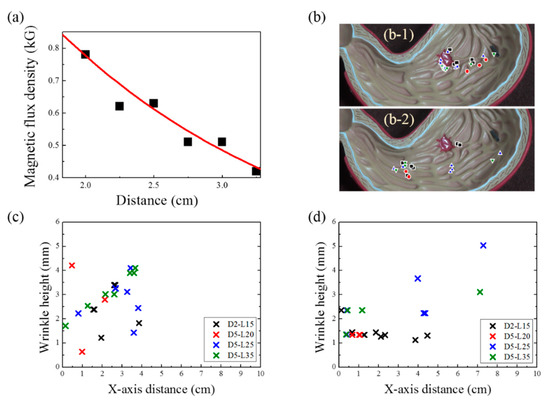 (a) Variation in magnetic-flux density with respect to the distance between the magnet and the samples; (b) Cessation location of magnetic actuation indicated by the X symbol for esophagus departure (1) and duodenum departure (2) cases; (c) Wrinkle height and X-axis distance where the soft-robot magnetic actuation ceased in the case of esophagus departure; (d) Wrinkle height and X-axis distance where the soft-robot magnetic actuation ceased in the case of duodenum departure.