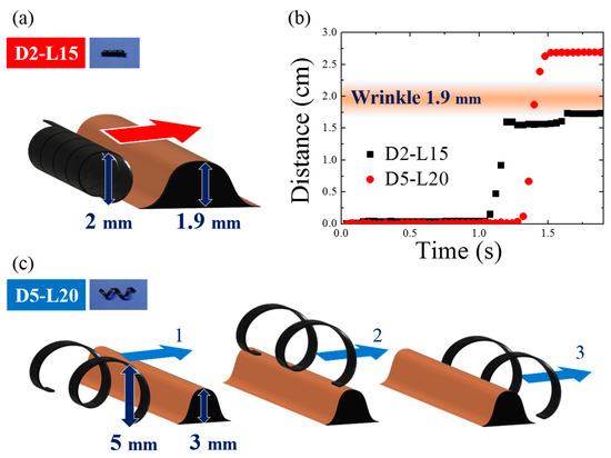 (a) Representative scheme for magnetomotility of D2-L15 at 1.9-mm wrinkle height; (b) Time-resolved magnetomotility of helical soft robots for D2-L15 and D5-L20 at 1.9-mm wrinkle height. D2-L15 stopped at the wrinkle with a height of 1.9 mm; (c) Representative scheme for magnetomotility of D5-L20 overcoming wrinkles with a height of 1.9 mm.