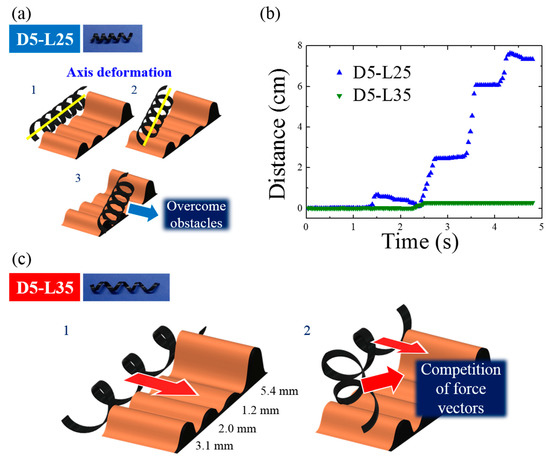 The most important and frequent example of failure is illustrated in Figure 8. During the magnetic locomotion over the wrinkles, D5-L25 retained its helical geometry without noticeable deformation. Instead of local deformation, D5-L25 shifted its axis to circumvent the wrinkles, as shown in Figure 8a. However, D5-L35 has a larger helical pitch and aspect ratio. Shape deformation occurred in D5-L35 because the mechanical local deformation of D5-L35 is easier. This local deformation generates shifts in the center of mass and a collision of the magnetic momentum vectors. As a result, magnetomotility ceased in the case of D5-L35. This example clearly demonstrates the importance of the helical pitch and the aspect ratio of the helical soft robots because both D5-L25 and D5-L35 have the same rolling resistances without local deformations.