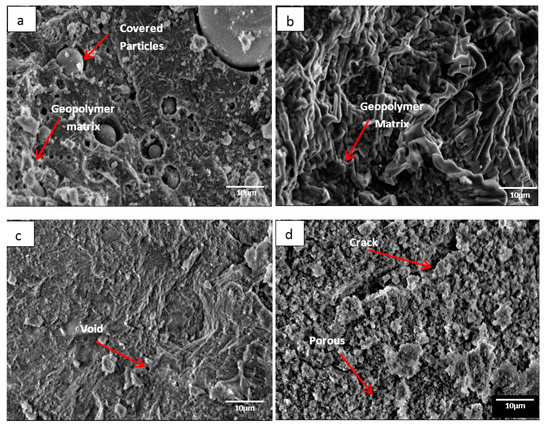 As the heat increased due to the increasing temperature, the geopolymer matrix in Figure 1c accelerated in its growth. The structure turned out to be dry and smooth, along with some void due to water evaporation. As the polycondensation reaction continued, a gel network underwent the rearrangement process in geopolymerisation. This promoted the geopolymer matrices to continue in its growth and to fill the space within the geopolymer composite structure (space-filling gel) [24].