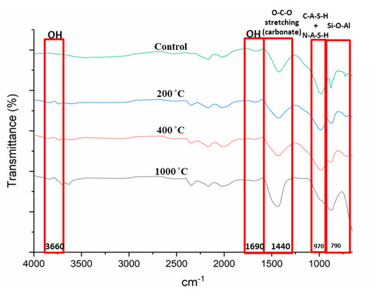FTIR spectra of dolomite/fly ash geopolymer before (control) and after exposure to 200, 400, 1000 °C.