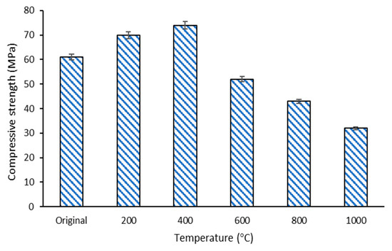 The result of the compressive strength noted in the composite before (control) and after the temperature exposure at 200, 400, 600, 800, and 1000 °C is shown in Figure 7. The graph displays that the compressive strength of DFA composites increased as the exposed temperature increased to 400 °C. At 400 °C, the compressive strength of the DFA geopolymer composites was 23% higher than that of the original (without temperature exposure) DFA composites. However, the strength of the composites began to decrease when the exposure temperature was elevated from 600 to 1000 °C. The DFA composite at 1000 °C exhibited lower compressive strength than those recorded at other temperatures. The highest strength was 74.48 MPa, after exposure to 400 °C, while the lowest strength was 32.54 MPa, upon exposure to 1000 °C. The difference between the highest and the lowest strength was 51.31%.