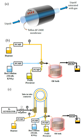 - Reactor System 2: this configuration comprised the tube-in-tube gas–liquid contactor upstream of the reaction coil. In the tube-in-tube contactor, an organic stream (heptane) was saturated with . The heptane stream was used to segment the aqueous one before entering the reactor. The two water solutions (base and iron precursor) were mixed and segmented in a PEEK cross junction (1 mm ID, Upchurch Scientific, Oak Harbor, WA, USA). The flow rate of the organic stream was set to 1 mL/min, while equal flow rates of 0.5 mL/min were used for the iron precursor and the base solutions. A schematic of the setup is shown in Figure 1c.