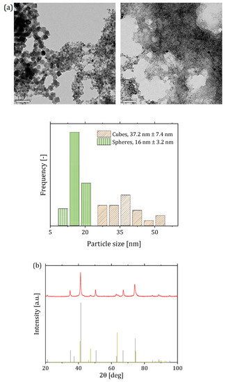 (a) Transmission electron microscope (TEM) micrographs of particles obtained from Reactor System 1, showing the presence of three different particle populations, with cuboidal, spherical and nanoflake morphology. Scale bar = 100 nm. The histogram reports the particle size distribution of spherical and cuboidal particles from Reactor System 1. Nanoflake particle size distribution was not determined due to strong aggregation between particles on the grid; (b) X-ray diffraction (XRD) pattern for the particles produced using Reactor System 1, showing the two identified phases: magnetite/maghemite (black vertical lines, pdf ref. 03-065-3107) and feroxyhyte (olive vertical lines, pdf ref. 01-077-0247).