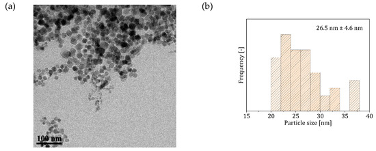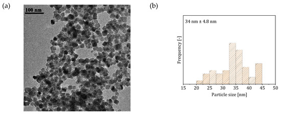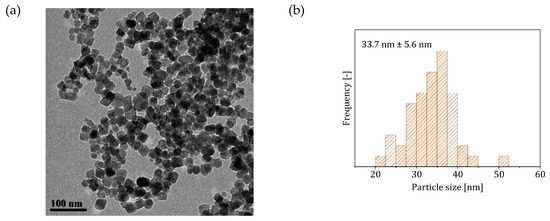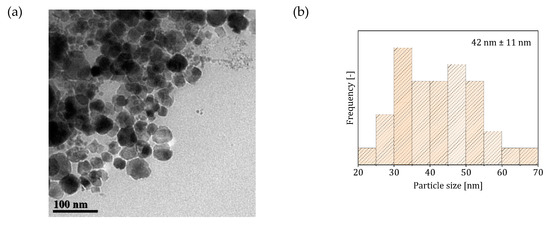 TEM micrographs revealed a different particle morphology than that obtained from Reactor System 1—spherical rather than cuboidal (Figure 3). The size distribution had an average size of 42 nm, and appeared rather wide (~26% relative standard deviation). Compared to Reactor System 1, the obtained particles appear more monodisperse, with a single population of particles, against the three distinct populations observed in Reactor System 1. The loss of the cuboidal shape, characteristic of this synthesis in batch under similar conditions (pH and reactant concentrations) [30,31,45], as well as the high polydispersity of the particles, may be due to interfacial adsorption affecting the synthesis. This phenomenon is the accumulation of solid particles at the interface between two liquids, driven by the minimization of the interfacial energy [46]. Zhang et al. [47] showed that, due to interfacial adsorption, asymmetric nanostructures can be generated, significantly different from those obtained in batch. The same authors also observed an increase in the particle polydispersity compared to batch, with the formation of two distinct particle populations, due to the generation of different concentration profiles within the droplet between the metal precursor and the particles.