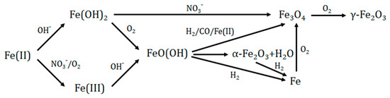 Reaction network leading to the formation of magnetite/maghemite based on the works of Correa et al. [38] and Larrea et al. [31]. Partially adapted from [38] with permission from Elsevier.
