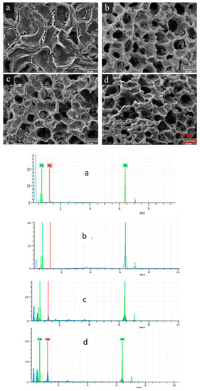 To compare the morphological structures of WBC and WBC1x, their surfaces were visualized (Figure 1). WBC had smooth, shallow, concave surfaces which were scatted with a certain number of small microholes (Figure 1), while the surface morphologies of WBC1x demonstrated a honeycomb-like structure (Figure 1b–d). The honeycomb-like structure had well developed pores containing rough surfaces and a great number of pore volumes, which could provide active sites for the adsorption of phosphate.