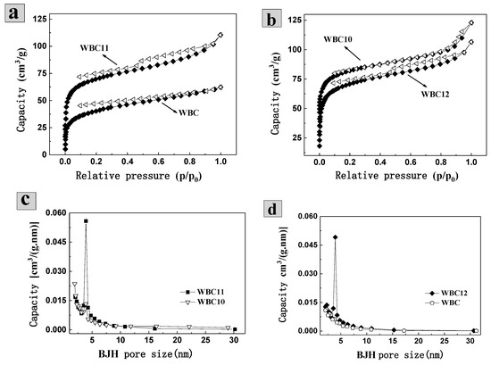 The isothermal adsorption of N2 found that the N2 adsorption capacity of WBC is 62.30 mL·g−1, which was lower than N2 adsorption capacity of WBC10, WBC11 and WBC12 (122.87, 110.46 and 106.52 mL·g−1, respectively) (Figure 2a,b). In addition, the isotherm of WBC and WBC1x were type-IV according to the International Union of Pure and Applied Chemistry (UPAC) classification, indicating that all the materials had a strong force with nitrogen gas and most of them had a mesoporous structure. All materials demonstrated a certain extent of H4 type hysteresis ring (around P/P0 = 0.5), indicating that the pores of the adsorbent are slits in some layered structures. The appearance of the hysteresis ring is due to the condensation effect of capillary-triggered N2 molecules condensing below the normal pressure and filling the mesoporous channels. The combination of N2-adsorption isotherms in the aperture profile (Figure 2c,d) of these materials further revealed that WBC and WBC1x are mesoporous in general, which agreed with the surface area and morphological structures of WBC and WBC1x discussed previously.