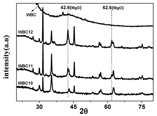 To study the crystal structure of WBC and WBC1x, their XRD patterns were shown in Figure 3 and it can be observed that the diffraction pattern of WBC did not show any crystalline peaks, indicating its amorphous nature. Sharp and strong peaks of magnetic Fe3O4 (2θ = 30.1, 31.6, 45.4, 56.3, 57, 75.3) were detected on WBC1x, suggesting that the Fe3O4 is highly crystalline. Signals of MgO were also detected at 42.5° and 62.6° for WBC11 and WBC12, as their intensity rose with the increase in MgCl2·6H2O addition. Additionally, a peak of γ-Fe2O3 (θ = 35.5) [8] was also found on WBC1x. Since the presence of non-magnetic γ-Fe2O3 could reduce the magnetic saturation of the magnetic adsorbent, its magnetic property was measured in external magnetic fields. There was no obvious hysteresis ring in the magnetization curve, all of them were S-shaped, and the remanence and coercivity were close to zero, indicating excellent superparamagnetic ability (Figure 4). The saturation magnetizations of WBC10, WBC11, WBC12 were 4.78, 1.65, 0.32 emg/g, respectively, indicating that the higher Mg2+ addition resulted in a weaker magnetic separation. It also implies that the use of a magnet or the application of an external magnetic field could recover WBC1x after treatment [19]. Figure 5 visualizes the magnetic separation of WBC12 from the liquid solution, implying the possibility of separating and reusing WBC12 after the sorption treatment, which held true for WBC10 and WBC11.