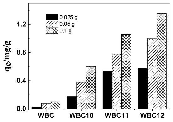 The effect of three doses (0.025, 0.050 and 0.100 g) of biochar and magnetic biochar on phosphate adsorption is shown in Figure 7. The sorption of phosphate onto WBC, WBC10, WBC11 and WBC12 grew by 4.0, 3.4, 1.9 and 2.3 folds when the adsorbent addition increased from 0.025 to 0.100 g, which was mainly due to an increase in the quantity of WBC and WBC1x in the liquid solution. Compared to WBC, a greater increase in phosphate adsorption was obtained for WBC1x, which might be attributed to the reduction in adsorption competition and mass transfer, which was due to the rise in the positive charge resulting from the higher zero charge point of WBC1x (Table 1). Additionally, the greatest increase came in WBC, which may be because the adsorption of WBC was more affected by mass transfer resistance; more specifically, the increase in the adsorption dose reduced the mass transfer resistance, so as to promote the adsorption of phosphate. In Figure 7, we can also observe that the rise in Fe2+/Mg2+ ratio also increased the phosphate adsorption, which might be attributed to the addition of Mg2+, which occupied the adsorption position of the biochar.