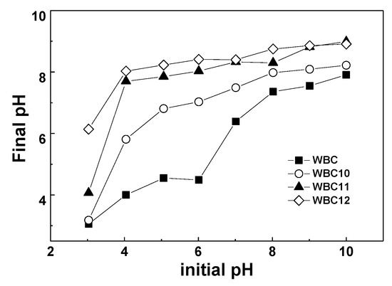 As shown in Table 1, WBC has a pHpzc of 4.8, implying that it is acidic, which is correlated closely with the raw material, temperature and time during the synthesis of WBC. However, all WBC1x are alkaline, since the value of pHpzc is greater than eight. This phenomenon might be attributed to the introduction of a high zero charge point (FeCl2·4H2O and MgCl2·6H2O) which changed the acid base of WBC1x, or the fact that the type of surface charge on WBC1x altered in a solution with a different pH. The pHpzc of WBC1x increased with the increase in Mg addition in the synthesis process, which is because the pHpzc of MgO (approximately 12) [17] is greater than Fe3O4 (around seven) [18], indicating that the pHpzc of WBC1x was positively related to the amount of MgCl2·6H2O addition.