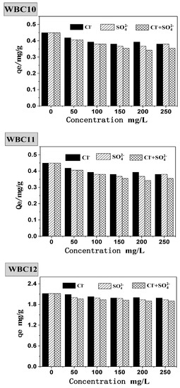 Natural bodies of water often contain various anions, which will undoubtedly interfere with the adsorption behavior of phosphate onto the adsorbent. Therefore, this paper studied the presence of Cl−, SO42− and Cl− + SO42− during the adsorption of phosphate onto WBC1x, as shown in Figure 9. Without the presence of Cl−, SO42−, the equilibrium adsorption capacity of WBC10, WBC11 and WBC12 was 0.45, 0.75 and 2.12 mg/g, respectively. The addition of Cl−, SO42− and Cl− + SO42− was attributed to a decrease in the equilibrium adsorption capacity of WBC1x, for example, the equilibrium adsorption capacity of WBC10, WBC11 and WBC12 decreased to 0.38, 0.68 and 1.99 mg/g, respectively, with the addition of Cl−. The influence of anions on the equilibrium adsorption capacity of WBC1x was not significant, and the influence anions was in the order of Cl− > SO42−> Cl− + SO42−. From the perspective of WBC1x, the materials that tend to be affected by the anion salt the most are in the following order: WBC10, WBC11, WBC12. The reduction in the equilibrium adsorption capacity in the presence of anions was due to the adsorption completion between anions and phosphate in the solution. Meanwhile, the possible reason that anions imposed the minimum impact on WBC12 adsorbent is because WBC12, synthesized with the highest magnesium addition (0.08 M MgCl2·6H2O), had the greatest surface charge capacity due to its highest pHPZC value (9.10) among WBC1x.