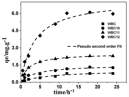 To understand the adsorption mechanism, the amount of phosphate adsorbed per gram of adsorbent—after adsorption onto WBC and WBC1x—as a function of time was plotted, and then fitted through three mathematics models, namely pseudo-first order, pseudo-second order, and infra-particle diffusion. The kinetic parameters of phosphate adsorption on WBC and WBC1x are given in Table 2. Among the kinetic models used, the pseudo-second order model described the experimental data best (Figure 10), with an R2 value no less than 0.952, revealing that chemisorption is the rate controlling step in the adsorption of phosphate onto WBC and WBC1x. The pseudo-first order and intra-particle diffusion model also described the experiment data reasonably well, with R2 values greater than 0.859, indicating that parameters such as pore structures and pore volume, etc., also play a certain role in the adsorption capacity of WBC and WBC1x. As shown in the literature, the surface charge and function groups of the adsorbent might affect the adsorption of phosphate. Since the WBC1x had a pHpzc greater than 8.0 after introducing a different mole ratio of Fe2+/Mg2+, a colloidal interface with a positive charge would be produced after the formation of surface hydroxyl compounds in the presence of the KH2PO4 solution (pH < 8), thereby enhancing the adsorption of phosphate onto WBC1x. No significant difference was observed between the function groups of WSB and WBC1x. Consequently, our results were consistent with the findings of Yao et al. [5] that the adsorption ability of both WBC and WBC1x is more likely related to their surface charge.