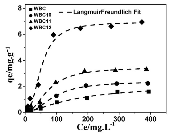 Among the three models, the Langmuir–Freundlich model has the best description of the adsorption of phosphate onto WBC and WBC1x, with an R2 value greater than 0.972, as shown in Table 3 and Figure 11. Based on the Freundlich parameters, the value of 1/n declined with the increase in Mg2+ addition, revealing that the increase in the number of adsorption sites in WBC1x, or the adsorption intensity of phosphate, would promote the adsorption process [24]. However, the value of KF increased with the increase in Mg2+ addition, which was in line with the rise in the MgO peak intensity after increasing the amount of MgCl2·6H2O addition, as described in Section 3.1. This result indicates that the amount of Mg2+ addition was the key factor that determined the adsorption capacity of WBC1x.