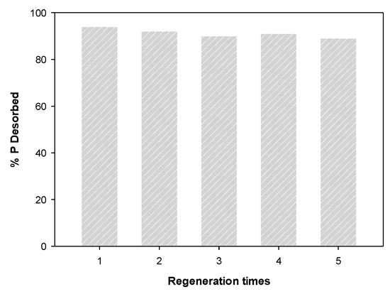 The result of the regeneration of phosphate-saturated WBC12 using NaOH are shown in Figure 12. The desorption rate was over 89% after five desorption experiments, indicating that WBC12 has high regeneration capacity and can be recycled, which corresponds to the physical adsorption rate obtained in the isothermal adsorption experiment.