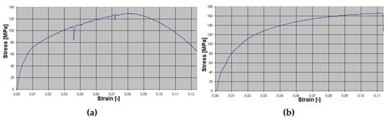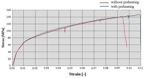 Based on the tension diagrams (Figure 7), we can assume that a slight increase of the sample strength (from 142.8 to 146.7 MPa) took place as a result of the applied preheating of 150 °C on the tested samples. The number of the tension tests was 10 for both methods (with and without preheating), and the depicted diagrams are similar to the average values based on their shapes. The result is that the stated graphs serve as documentary material. In most cases, the fracture of the specimens occurred in the welded joints. Fracture initiation was only observed in the melting-down location in occasional cases, but the fracture propagated toward the welded joint.