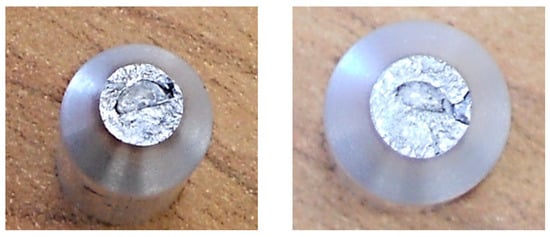 The deficiency of the alpha-geometry (Figure 5) of the weld surface resulted in widespread failures in the welded joint. More specifically, improper welds were created, as shown in Figure 8, and the melting of the weld surface did not take place either. The proof of this statement is the macrostructure of the fracture area on the tested sample, in which we can observe grooving that was caused by the machining tool during the preparation of the welding area. Only the filler material was molten, and its thickness was insufficient after machining in accordance with the geometry of the samples for the fatigue evaluation (or the tension tests). It was formed by the thick ring of the filler material, which was softened by welding, so we cannot speak of sufficient joint strength.