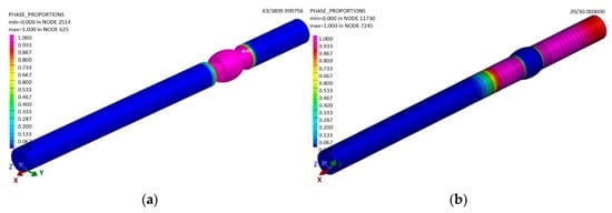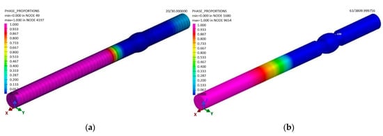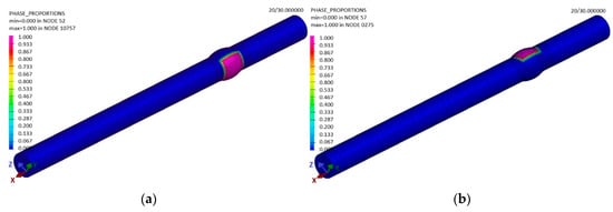 The applied term Phase 1 represents the percentage of the abundance of the basic material (pink 100%, indigo 0%) that was not affected during welding by heat (Figure 17). After cooling the welded material to a temperature of 20 °C, the software showed a modification in Phase 1. This was caused by the fact that the weld bead still had a high temperature after welding (Figure 16), which was then distributed within the material due to conduction. This resulted in the impact on the material (Figure 17b). Practically, the welded joint was formed by two weld beads in the shape of a semicircle. Phase 2 represents the abundance of the welding metal (Figure 17a) and its impact by heat in weld bead No 1. A similar simulation was performed for Phase 3 (Figure 18), as the weld bead is formed by the same technology as the first one.