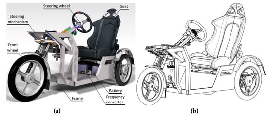 (a) The 3D CAD model of the designed vehicle and (b) the schematic drawing of the three-wheeled vehicle with the non-conventional mounting of the steered front wheel with the frame from the tested material EN AW 6063.T66.