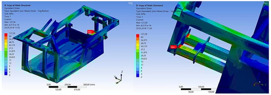 In the analysis, we investigated the points at which the concentration of stresses, as well as the intensity of the stresses and shifts resulting from loading forces, took place. Two boundary conditions had to be considered in the static analysis. The first condition takes place when the designed vehicle is at rest or in the linear motion, and there are no acting lateral forces developed by the motion in the curve. The second boundary condition takes place in the crossing of the curve with the regarded lateral acceleration of 0.5 multiplication of the standard gravitational acceleration (g = 9.81 m·2s−2). The construction design of the frame E3-cycle was created according to the technical standards and rules of designing with the implementation of knowledge obtained during the previous simulations. The numerical strength analysis was used to analyse all possible states of the vehicle in real handling. In the designed vehicle (Figure 29), no devices initiate excited vibrations that would cause system resonance, thus damaging the frame, which secures its strength and structural integrity.