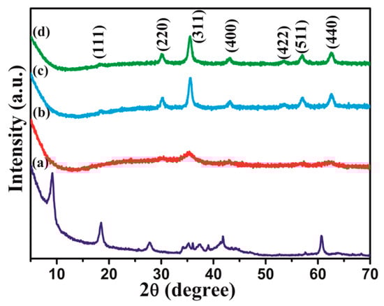XRD patterns of (a) Ti3C2Tx MXenes, (b) precursor of 2 wt.% Ti3C2Tx/NiZn ferrite, precursors hydrothermally treated at 200 °C for 2 h: (c) Ni0.5Zn0.5Fe2O4, (d) 2 wt.% Ti3C2Tx/NiZn ferrite.