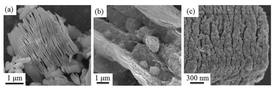 SEM images of (a) pure Ti3C2Tx MXenes, (b) precursor of 2 wt.% Ti3C2Tx/NiZn ferrite composites, and (c) after hydrothermal treated at 200 °C of precursor of 2 wt.% Ti3C2Tx/NiZn ferrite composites.