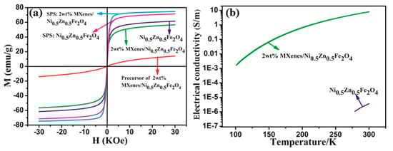 (a) Hysteresis loops of precursor, powders, and bulks of pure ferrite and 2 wt.% Ti3C2Tx/NiZn ferrite composites, (b) temperature dependence of the electrical conductivity of pure ferrite and 2 wt.% Ti3C2Tx/NiZn ferrite composites.