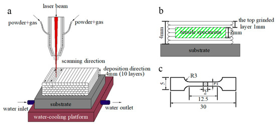 A 1.5-kW fiber laser with a coaxial powder feeding and water cooling system was used to fabricate the multi-layer laser cladding, as sketched in Figure 1a. The key processing parameters were modified and adjusted as followings: laser power density of 430 W·mm−2, laser scanning speed of 8 mm·s−1, overlapping rate of 50% and powder delivery rate of 4 g·min−1. High purity nitrogen (99.999%) was used as both a shielding gas and a carrier gas with a flow rate of 10 L·min−1. After 10 cladding layers were deposited, the MSS coatings with a dimension of 90 × 40 × 4 mm were fabricated successfully.