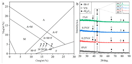 Phase constituent of the laser-cladded MSS coatings with different V contents: (a) Schaeffler phase diagram; and (b) XRD pattern.