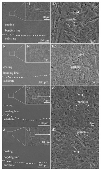 Figure 3 shows SEM micrographs of the cross-section of the laser-cladded MSS coatings with different V contents. It can be clearly seen that all the laser-cladded MSS coatings were free of defects, such as pores and cracks, and exhibited a superior metallurgical bonding with the substrate. By comparing the specimens demonstrated in Figure 3a1–d1, the coatings were found to compose mainly of lath-shaped martensite, and refined with increasing V content gradually. This is consistent with the results reported by Hui et al. [17] that the microstructure of a medium carbon steel became finer and more uniform with the increasing content of the microalloying element V (0.15~0.45%). The grain refinement effects are generally associated with two aspects: (i) the precipitation pining effect generated by the fine vanadium carbide VC and/or vanadium nitride VN particles; and (ii) the solute dragging effect caused by suppressing the grain boundary migration through the solute dissolved in the austenite [9,10,11]. The existence of the fine V-bearing particles, confirmed by the XRD and SEM results, is mainly responsible for the refined grain size of the laser-cladded coatings.