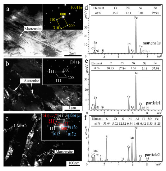 TEM results of the V-free MSS coating: (a) Bright-field (BF) image and SAED pattern of M; (b) Dark-field (DF) image and SAED pattern of A; (c) DF image and SAED pattern of M23C6; (d) EDS analysis of martensite; and (e,f) EDS analysis of particles 1 and 2 denoted in (c), respectively.
