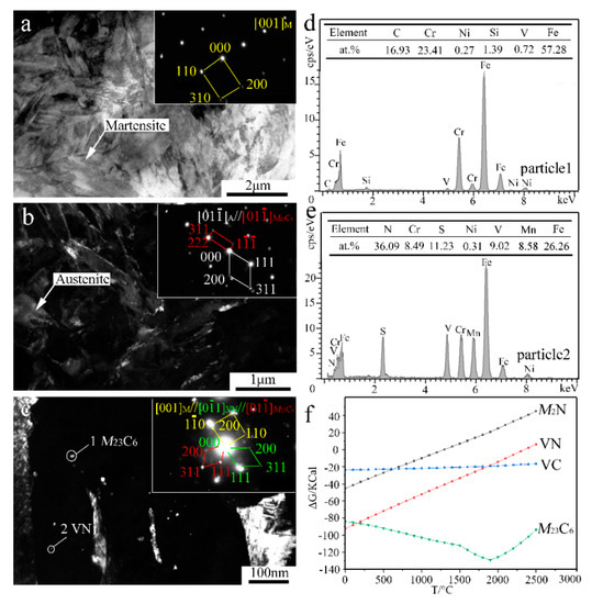 TEM results and Gibbs free energy (ΔG) analysis of the 0.5% V-bearing MSS coating: (a) BF image and SAED of M; (b) DF image and SAED of A and M23C6; (c) DF image and SAED of M23C6 and VN; (d,e) EDS analysis of particles 1 and 2 denoted in (c), respectively; and (f) variation relationship between ΔG and temperature.