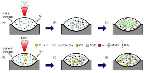 Figure 6 schematically depicts the possible formation mechanism of the composite particles during laser cladding the V-free and V-bearing MSS coatings. When laser beams irradiated on the surface of the preset cladding layer under the N2 protective atmosphere, the preset layer was heated rapidly and in situ nitrided by the high energy absorbed (Figure 6a,d). The Marangoni convection facilitated the recombination of Fe, Cr, V, N, and C atoms in the molten pool, and consequently to form M23C6 and M2N in the V-free MSS coating (Figure 6b,c), M23C6 and VN in the V-bearing MSS coating (Figure 6e,f) based on Figure 4 and Figure 5, respectively.