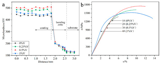Mechanical properties of the laser-cladded coatings with different V contents: (a) microhardness distribution; and (b) tensile curves.