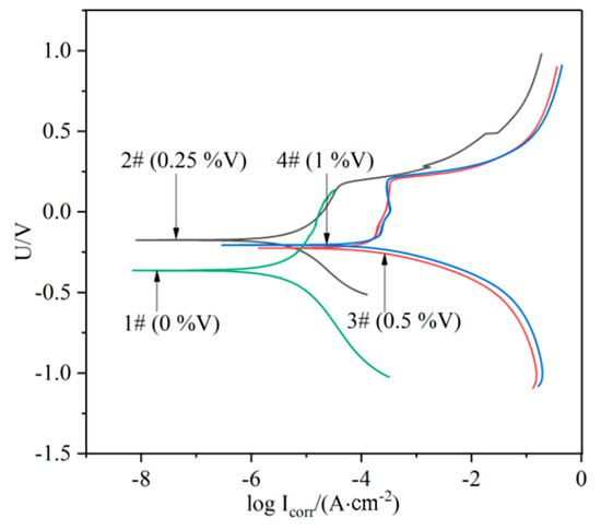 Polarization curves of the laser cladding layers with different V contents.