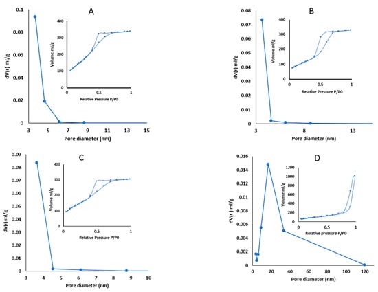 Pore size distribution of different SilverSil xerogels: (A) (90:10) (inset Brunauer–Emmett–Teller (BET) isotherm of the same matrix), (B) (70:30), (C) (50:50) and (D) (30:70).