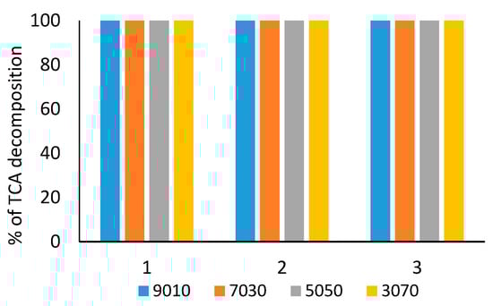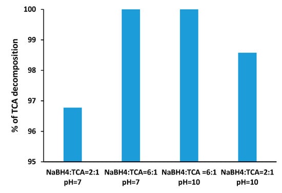 Finally, Figure 7 presents the effect of TCA:NaBH4 molar ratio and the pH on the TCA decomposition yields. As expected, higher levels of TCA reduction were obtained for higher NaBH4 concentrations, with complete TCA decomposition taking place also at pH 7 provided that borohydride is used in 6:1 molar ratio with respect to the substrate.