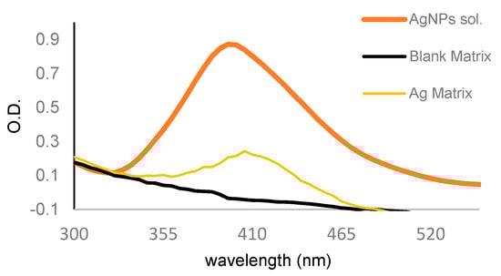 UV-vis absorption spectrum for the 30:70 SilverSil xerogel, blank matrix and silver nanoparticles.