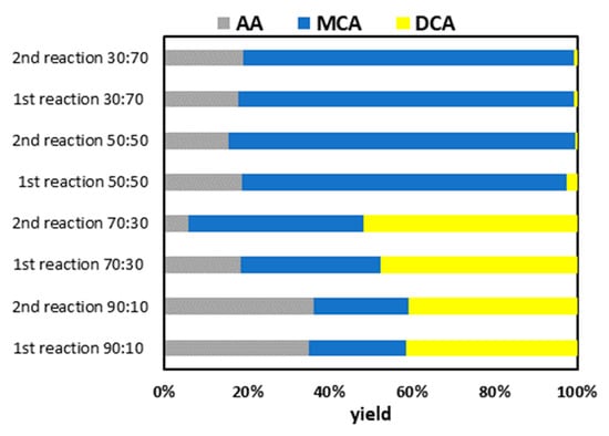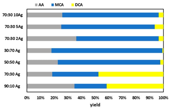 Product distribution after 2 h reaction in TCA reductive dehalogenation of different SilverSil xerogels with NaBH4 as reducing agent in 6:1 molar ratio in two reaction runs, [TCA] = 1.4 × 10−3 M, [BH4−] = 8.4 × 10−3 M.
