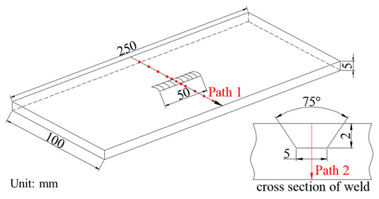 Figure 1 shows a sketch of the repair welding sample with the single-pass welding. The dimensions of the base metal are 250 mm (length) × 10 mm (width) × 5 mm (thickness). The parent metal and filler wire are 304 stainless steel and A102, whose chemical compositions were tested by a Q4 Tasman direct reading spectrometer (BRUKER Company, Karlsruhe, Germany) as shown in Table 1. The chosen welding method is manual arc welding. The repair length, width, and depth are 50 mm, 5 mm and 2 mm, respectively. The weld groove angle is 75°. The electrode diameter is 4 mm. The arc current, voltage and welding speed are 110 A, 20 V and 3 mm/s, respectively. After XRD measurements of the as-welded residual stress, the UIT was employed to treat the welding region, heat affected zone (HAZ) and parent metal on the top surface. The impact pin has a cylindrical flat head with the diameter of 20 mm and length of 45 mm. The impact amplitude and frequency are 20 μm and 20 kHz, respectively.